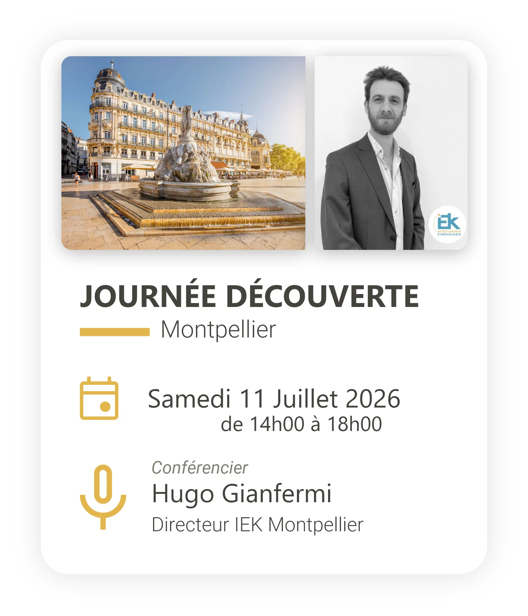 Créée en 2025 par Hugo Gianfermi, kinésithérapeute de formation, kinésiologue certifié, et formateur d’anatomie, l'IEK Montpellier vous permet de suivre un parcours adapté à chacun grâce à une pédagogie progressive alliant la science du corps, la psychologie ainsi que l'énergie. Cette structure pédagogique vous permet d'intégrer en profondeur chaque branche de la kinésiologie.